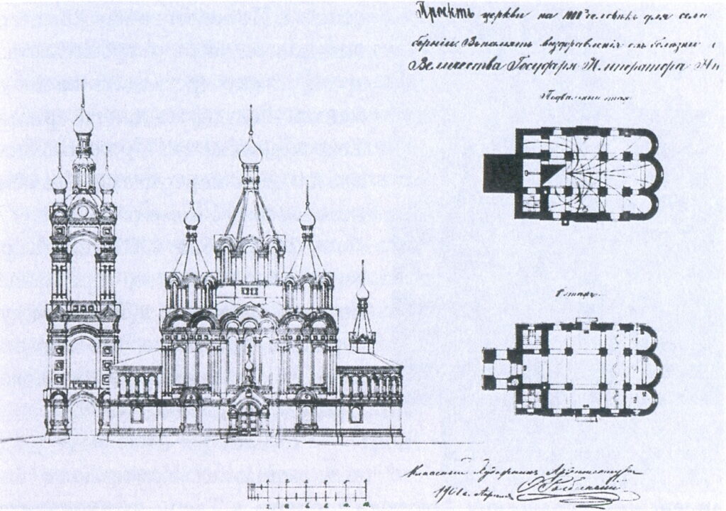Подготовительные работы по возведению храма начались годом ранее. 26 мая 1901 года классный художник архитектуры Московского губернского правления Федор Васильевич Рыбинский составил чертежный проект церкви. Это был каменный 3-престольный храм на 1000 прихожан с 3-ярусной колокольней в память выздоровления от болезни в 1900 году императора Николая II [2].