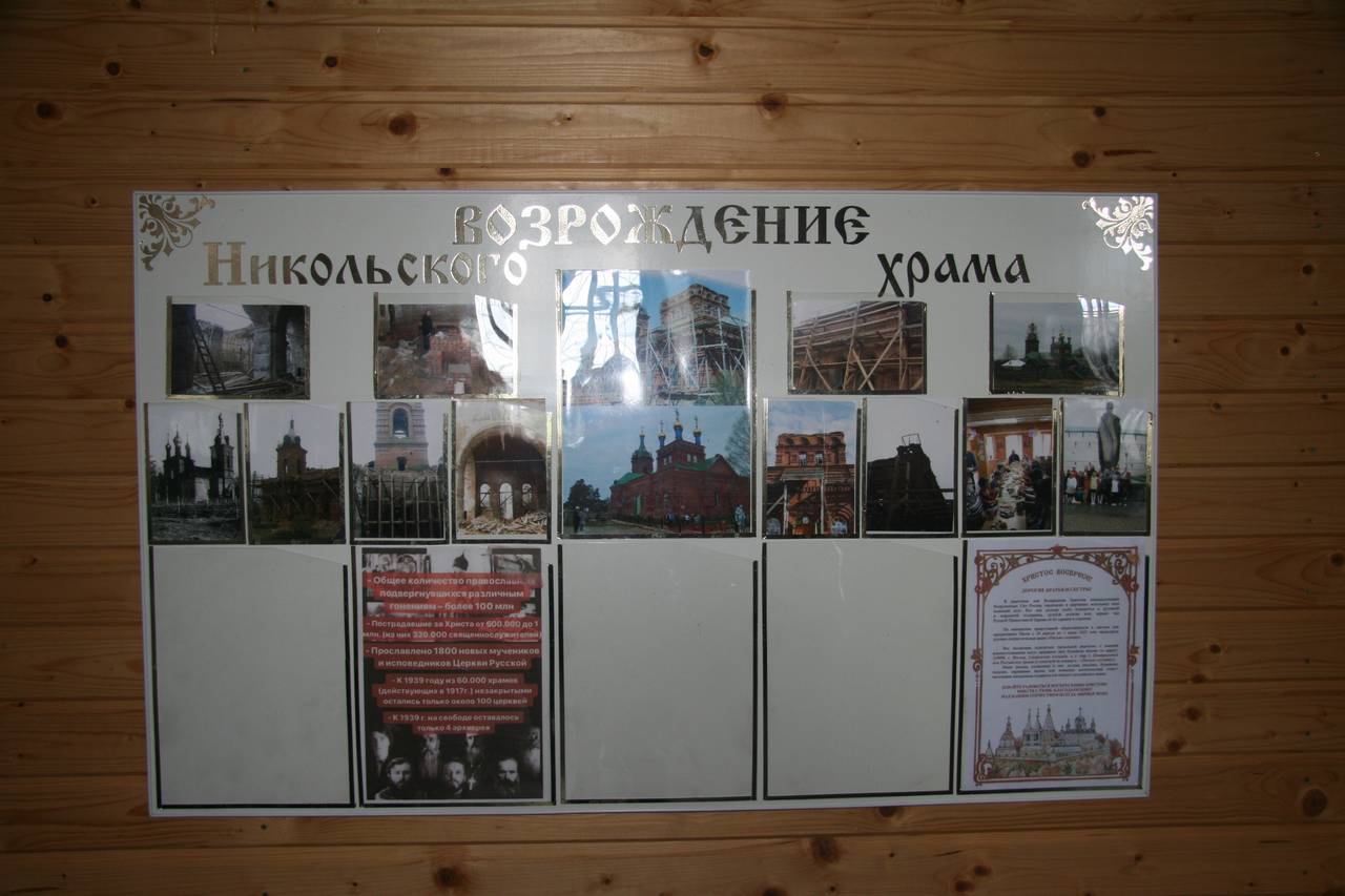 Каменная Никольская церковь была построена И.Н. Сураковым на месте одноименного деревянного храма. Новое здание заложено 1 июня 1898 г., о чём свидетельствует надпись, высеченная в цоколе церкви. Освящен храм в 1907 г. Здание, возможно, строила местная артель каменщиков с использованием типовых проектов — кирпичное, неоштукатуренное здание выстроено в русском стиле.